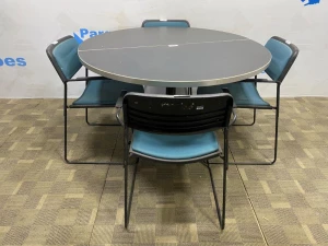 01 MESA DE REUNIÃO E 04 CADEIRAS FIXAS COM BRAÇOS ENCOSTO E ASSENTO ESTOFADO EM TECIDO NA COR VERDE. (NO ESTADO)