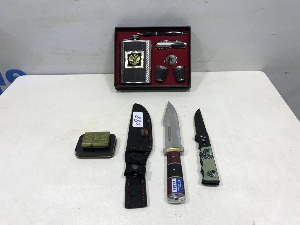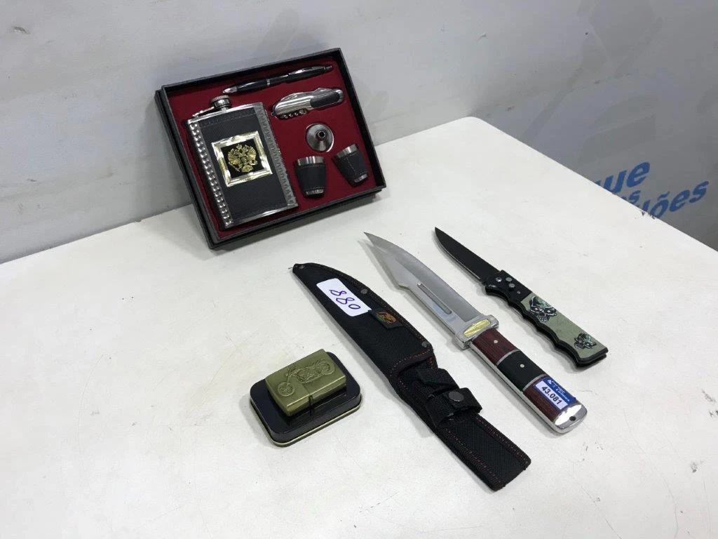 | Descrição: | 01 KIT COM: 01 ABRIDOR DE VINHO E 01 CANTIL DE BOLSO COM FUNIL, 02 COPINHOS E 01 CANETA, 01 FACA, 01 CANIVETE E 01 ISQUEIRO TIPO ZIPPO . (NO ESTADO). |