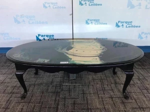 01 MESA DE CENTRO EM MADEIRA ESCURA,COM TAMPO RESINADO. ( NO ESTADO)