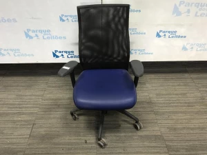 01 POLTRONA GIRATORIA GIRATORIA ESTOFADA COM CORINO AZUL E TECIDO COR PRETO. PAT - 61096 ( NO ESTADO).