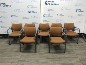 07 CADEIRAS FIXA COM BRACOS REVESTIDAS COM TECIDO COR LARANJA. PAT 61199. ( NO ESTADO).