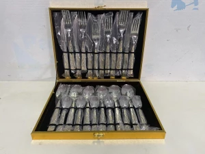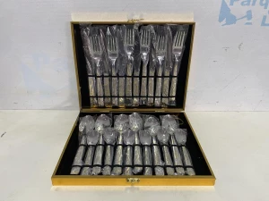 01 FAQUEIRO COR PRATA COM 24 PECAS COM MALETA. PAT 61456. ( NO ESTADO).