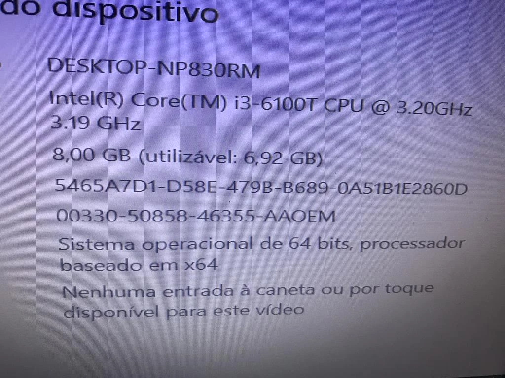 | Descrição: | 01 MICROCOMPUTADOR INTEL CORE I3-6100, 8BG RAM, HD 500GB, MONITOR, TECLADO E MOUSE. PAT (NO ESTADO). |