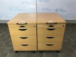 02 GAVETEIROS COM RODÍZIOS EM MADEIRA CLARA COM 4 GAVETAS . TAG - 212A04, 212B02 PAT - 62585, 62586 (NO ESTADO).