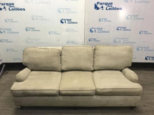 01 SOFÁ DE TRÊS LUGARES ESTOFADO EM TECIDO COR BEGE COM SETE ALMOFADAS SOLTAS. TAG ( AV9358U ) PAT 62885 (NO ESTADO).