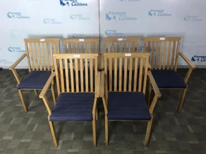 06 CADEIRAS COM BRAÇOS FIXOS EM MADEIRA CLARA. TAG 10609 - 21311 - 20803 - 103A05 - 10504 - 20805 PAT 62771 (NO ESTADO)