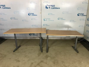 02 MESAS COM BASE DE METAL E TAMPO EM MADEIRA CLARA. TAG (0057 - 102B01) PAT 63032 - 63072 (NO ESTADO).