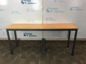 01 MESA COM BASE DE METAL E TAMPO EM MADEIRA CLARA. TAG (102B02) PAT 63092 (NO ESTADO).