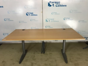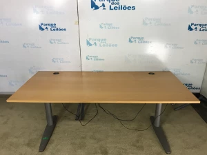 01 MESA COM BASE DE METAL E TAMPO EM MADEIRA CLARA. TAG (10402) PAT 63036 (NO ESTADO).