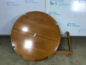 01 MESA DE CENTRO EM MADEIRA ESCURA COM TAMPO CIRCULAR. TAG (0002) PAT 63037 (NO ESTADO).