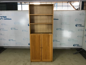 01 ESTANTE ALTA EM MADEIRA CLARA COM QUATRO PRATELEIRAS E DUAS PORTAS. TAG (103A01) PAT 63038 (NO ESTADO).