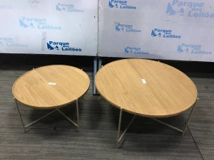 02 MESAS DE CANTO PÉS EM FERRO TAMPOS EM MADEIRA. PAT - 61615. ( NO ESTADO).