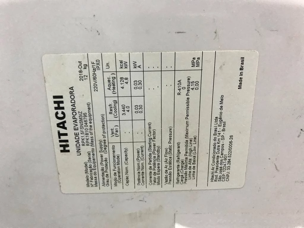 | Descrição: | 01 AR CONDICIONADO 12 MIL BTUS. TAG (BH1469S) PAT 62709 (NO ESTADO). |