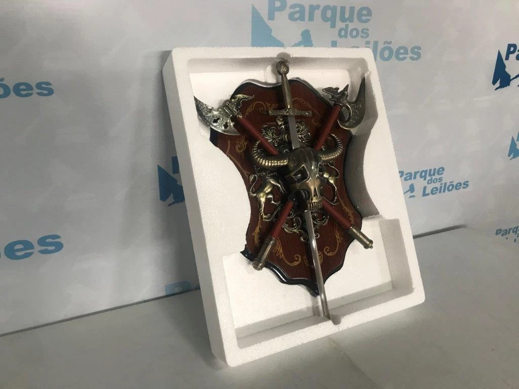 | Descrição: | 01 ENFEITE DE PAREDE MEDIEVAL , MACHADO , ESPADA E ESCUDO. PAT 36071. ( NO ESTADO) |